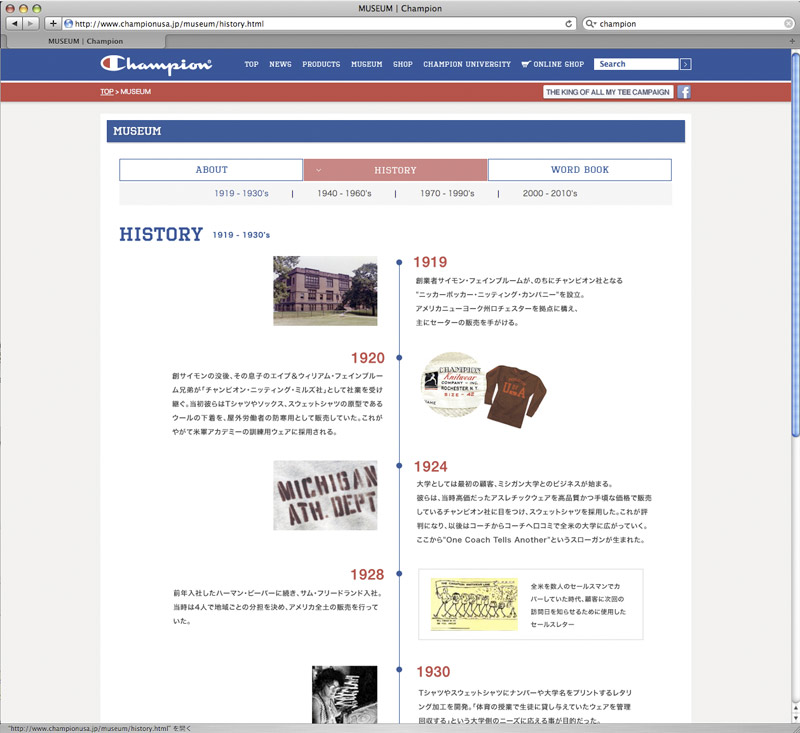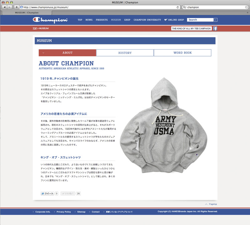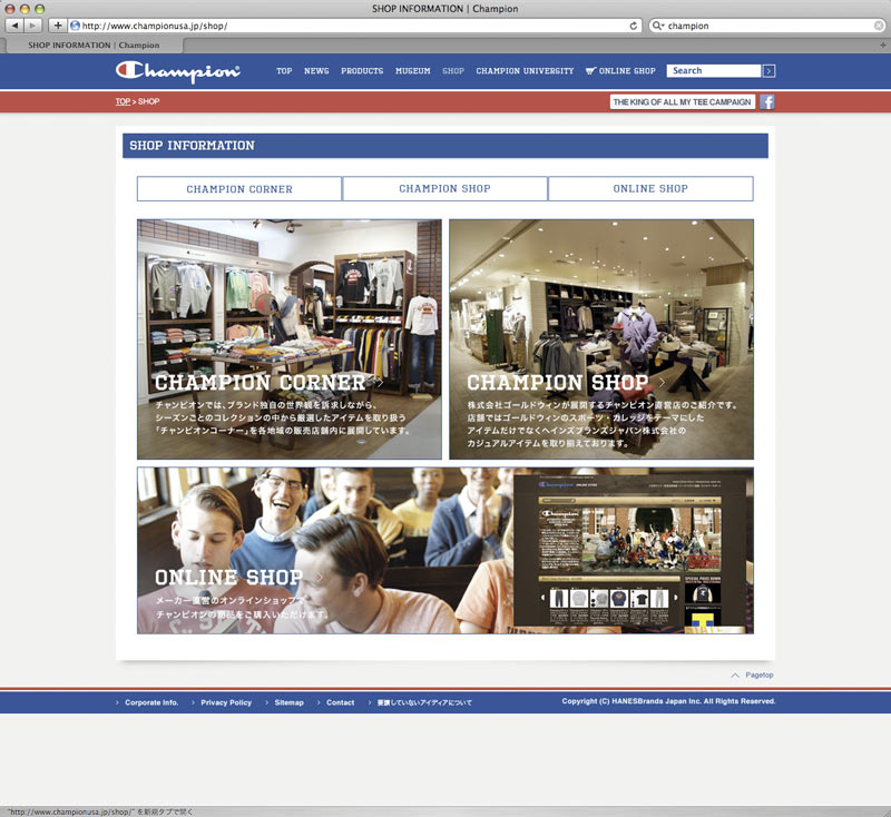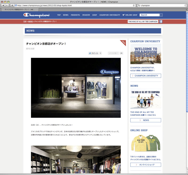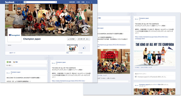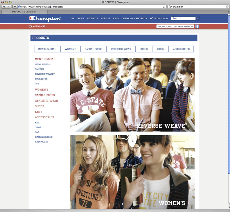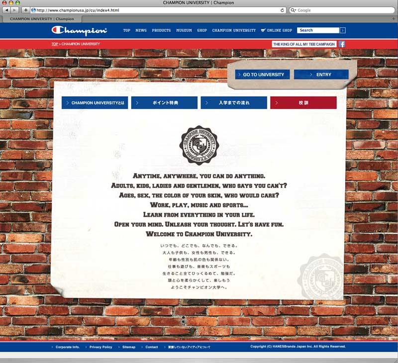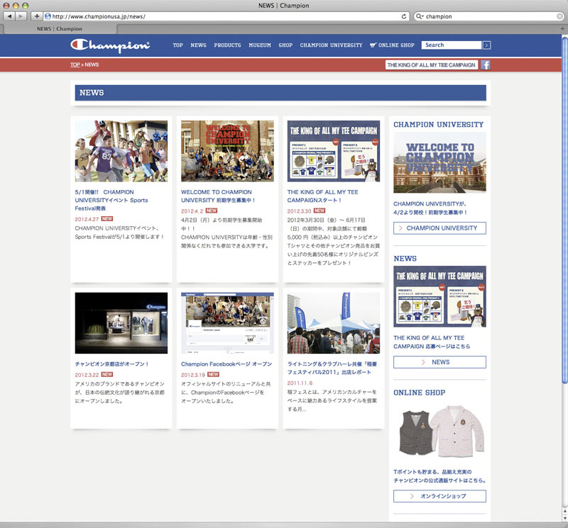 CHAMPIONブランドの認知度アップ、WEB会員の獲得、WEBアクセス数アップを目的に、ブランドニュースや商品情報、歴史をよりわかりやすく掲載。FacebookやTwitterとも連動し、プロダクト情報やキャンペーン情報等を定期的に配信。フルリニューアルと共に、マイページ内に仮想大学「CHAMPION UNIVERSITY」を開校し、ウェブキャンペーンを実施。
