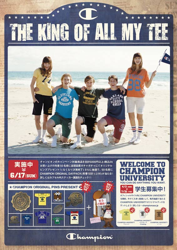 店頭では売り場の活性化、CHAMPIONブランドの認知度アップを目的とし、期間中、対象店舗で対象商品をお買上の先着50名様にオリジナルピンズとステッカーが貰える「THE KING OF ALL MY TEE CAMPAIGN」を実施。