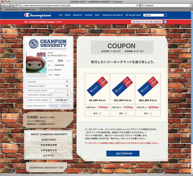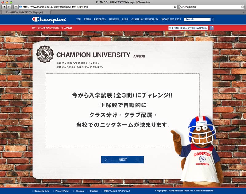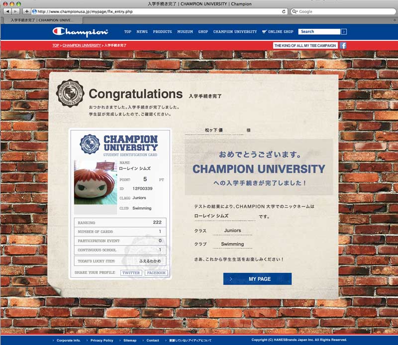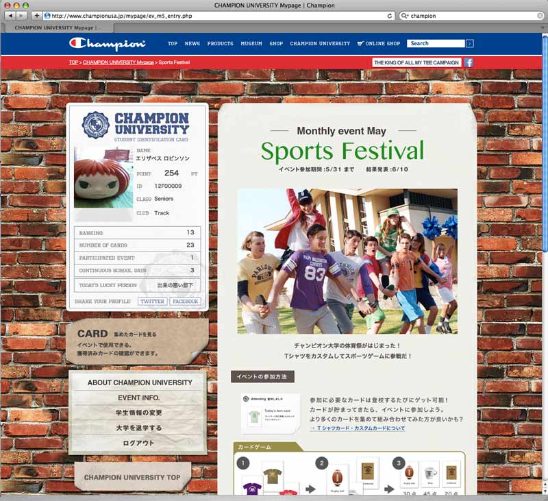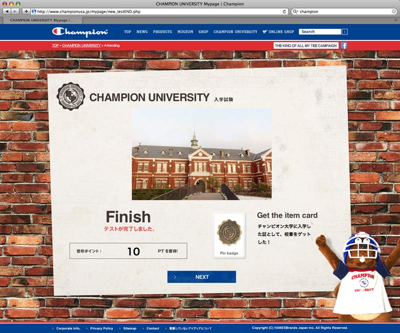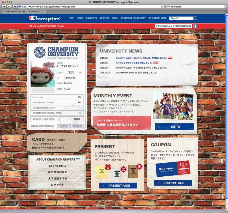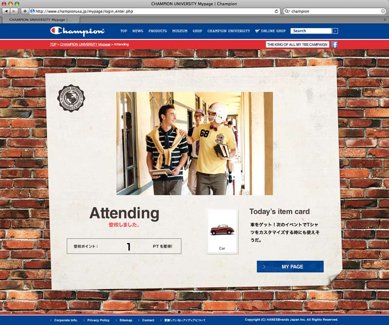 In conjunction with the full renewal of official site, D.K.S.G. established an imaginary school, "CHAMPION UNIVERSITY" within My Page, and executed WEB campaign. Point system was developed at My Page with special perks for repeated access and brand awareness enhancement.