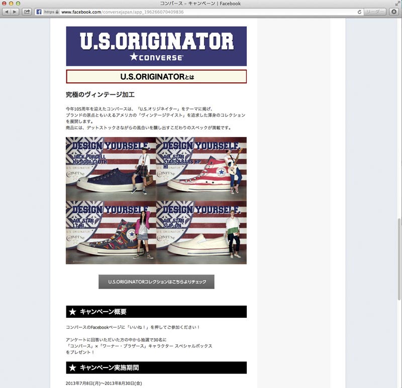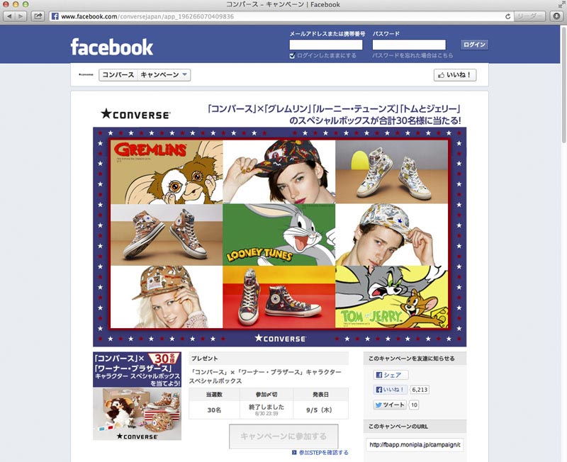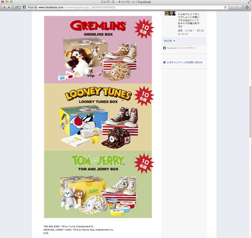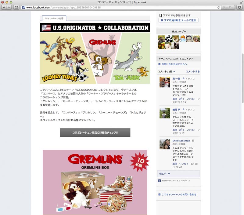 コンバースの旧き良きアメリカのヴィンテージテイストを追求した「U.S.ORIGINATOR」コレクションとワーナー・ブラザースのキャラクター「グレムリン」「ルーニー・テューンズ」「トムとジェリー」とのコラボ商品発売を記念して、Facebookページにてモニプラ・プレゼントキャンペーンの企画・実施。