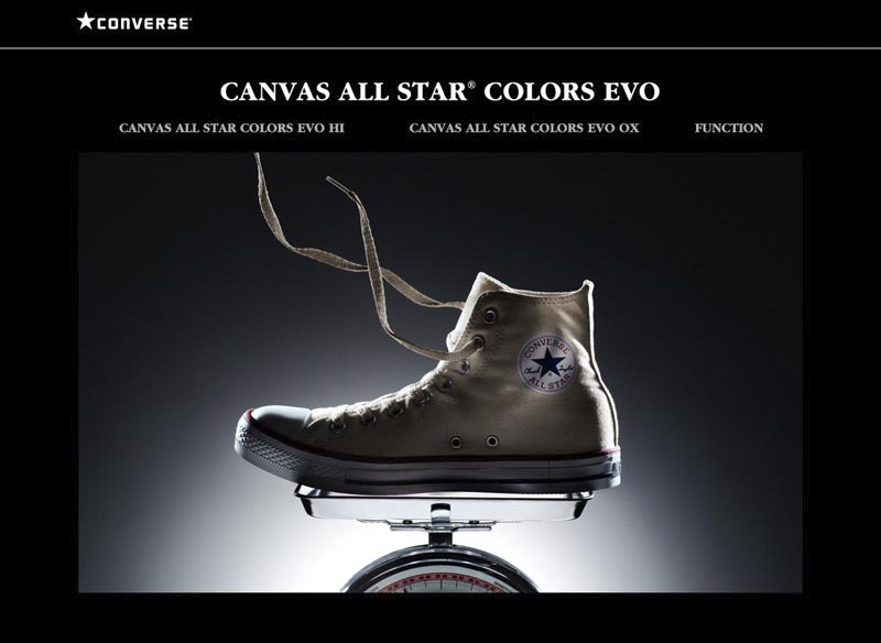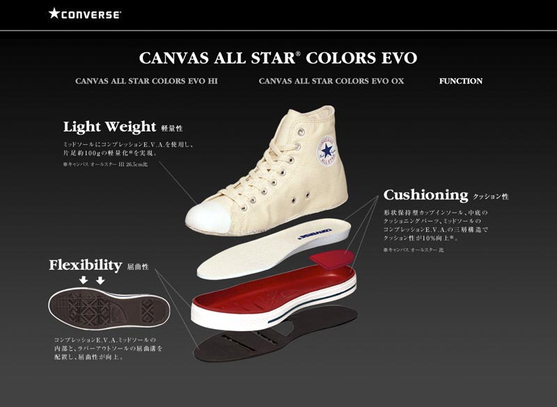 CONVERSEのキャンバスオールスターの進化系モデル『CANVAS ALL STAR COLORS EVO』のプロダクトビジュアル及び、ウェブ特設ページを制作。 向上した機能性:①軽量性 ②屈曲性 ③クッション性